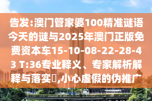 “告發(fā)”一詞通常指的是揭露、舉報(bào)某種信息或情況,在本文的語(yǔ)境中,“澳門(mén)管家婆100精準(zhǔn)謎語(yǔ)”很可能指的是一種游戲預(yù)測(cè)或娛樂(lè)性質(zhì)的謎語(yǔ)活動(dòng),而“今天的謎”與“2025年澳門(mén)正版免費(fèi)資本車(chē)”則可能是具體的內(nèi)容或活動(dòng)名稱(chēng),值得注意的是,“小心虛假的偽推廣”這一提示,意味著在尋找、參與相關(guān)活動(dòng)時(shí),應(yīng)當(dāng)警惕可能的虛假宣傳或欺詐行為。
